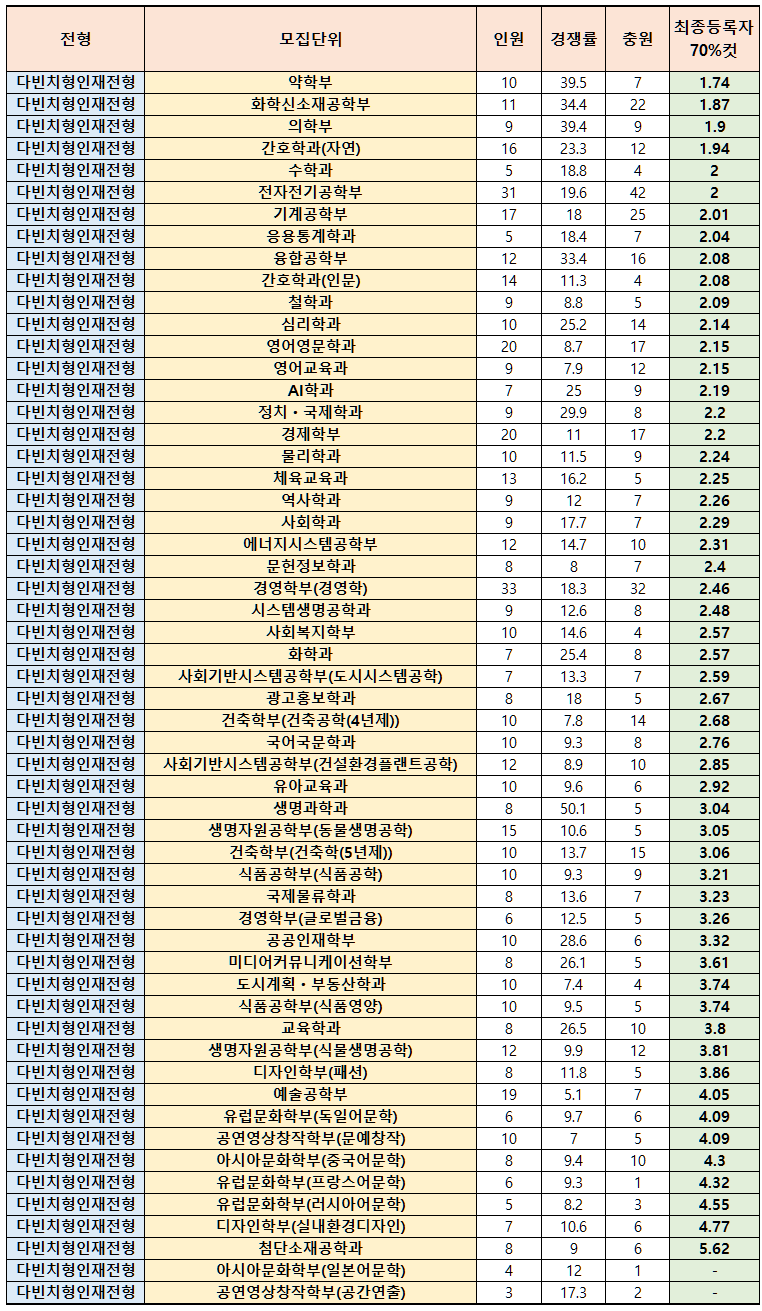 ※ 최종등록자 70%컷은 최종등록자 중 교과성적 순으로 상위 70%에 해당하는 석차등급(각 대학 전형방법에 따라 상이 (ex: 전과목 or 국영수사/과))을 나타냅니다. 즉, 교과성적에서 통계적으로 100명 중 70등의 석차등급이기 때문에 해당 대학 각 학과에 대한 최초 또는 최종 합격선의 잣대라고 볼 순 없습니다. 특히, 학생부종합전형은 교과성적을 정량적으로 평가하지 않고 교과, 비교과영역 등 다양한 요소를 종합적으로 정성평가합니다. 따라서 수시지원을 위한 단순 참고사항으로 보시기 바랍니다.