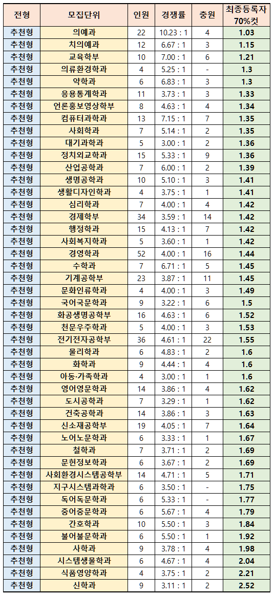 ※ 최종등록자 70%컷은 최종등록자 중 교과성적 순으로 상위 70%에 해당하는 석차등급(각 대학 전형방법에 따라 상이 (ex: 전과목 or 국영수사/과))을 나타냅니다. 즉, 교과성적에서 통계적으로 100명 중 70등의 석차등급이기 때문에 해당 대학 각 학과에 대한 최초 또는 최종 합격선의 잣대라고 볼 순 없습니다. 특히, 학생부종합전형은 교과성적을 정량적으로 평가하지 않고 교과, 비교과영역 등 다양한 요소를 종합적으로 정성평가합니다. 따라서 수시지원을 위한 단순 참고사항으로 보시기 바랍니다.