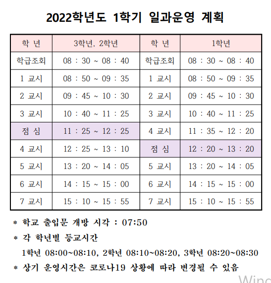 용곡중학교 2022학년도 상반기 일과운영 계획