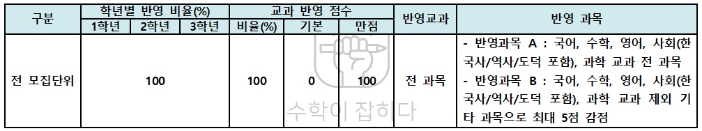 -지원 가능한 학생부 교과 성적은 국어, 수학, 영어, 사회, 과학 교과 전과목 석차등급 평균이 1.5등급 이내는 되어야 할 것으로 예상된다.