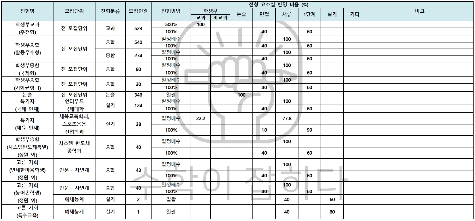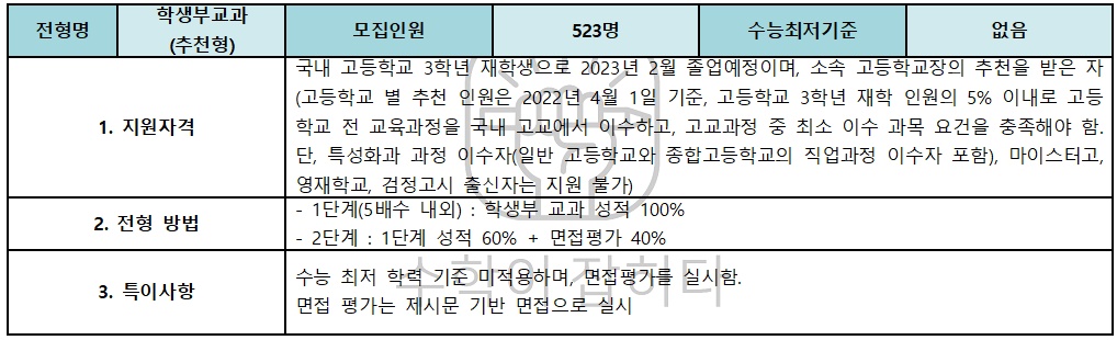 -활동우수형과 국제형 전형 모두 수능시험 최저 학력 기준을 적용하므로 수능 시험 대비에도 최선을 다해야 함을 잊어서는 안된다.