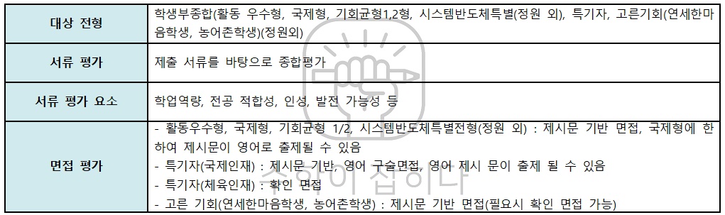 - 면접은 제시문 기반 면접을 실시하게 때문에 추후 세부 내용을 반드시 확인하되, 기출 문제를 통해 출제 경향과 난이도 수준 등은 미리 살펴보는 것이 좋다.