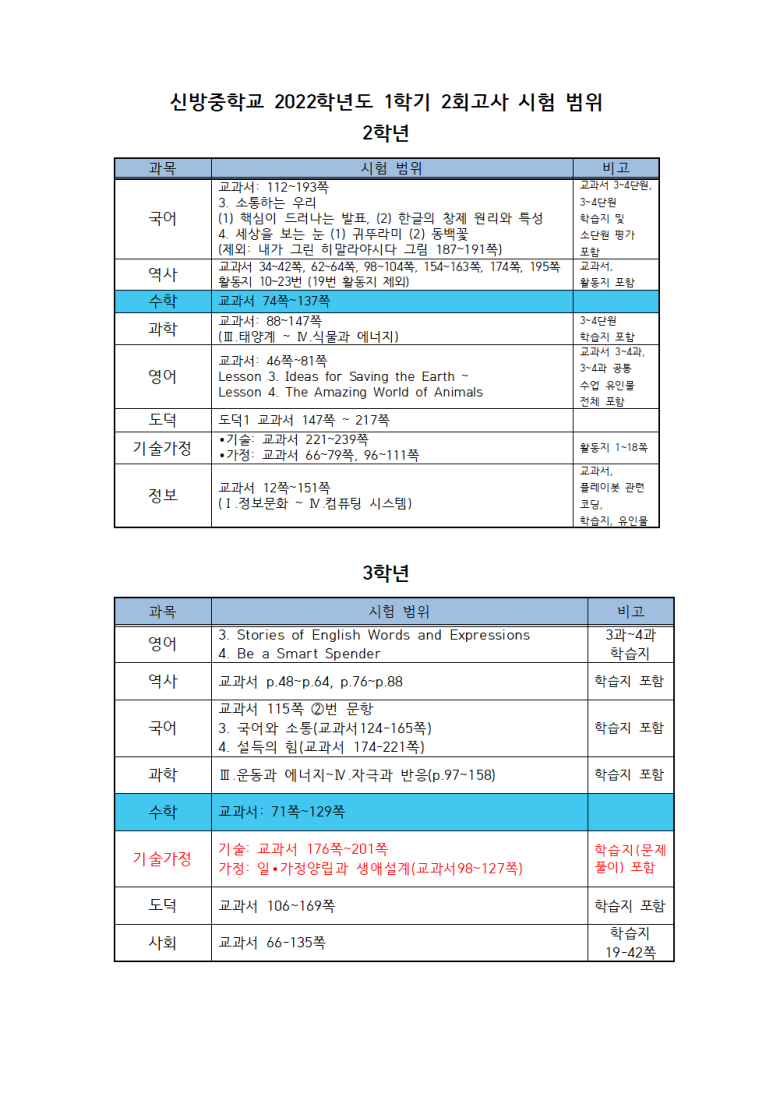 2022학년도 1학기 2회고사 2,3학년 시간표 및 시험 범위를 안내합니다.