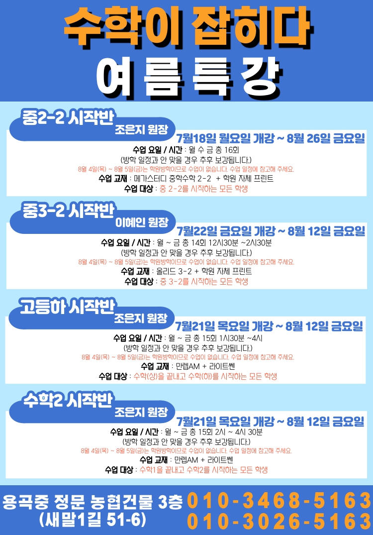 | [공지] 여름방학 특강 시간표 - 수학이잡히다 (0) | 2022.06.18 |
